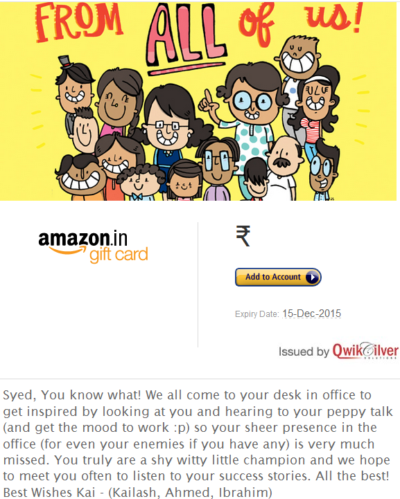 Received an awesome Gift Cardanwaarullah (old website)December 15, 2014Personal I just received an awesome Gift card from my awesome friends called as Kai of my ex-company 🙂 Thank you guys, you made me extremely happy!!! Thanks Guys 🙂