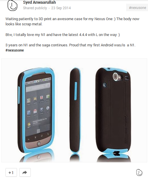 The journey of repairing my Nexus One began here. I saw this cute little cover for my Nexus One and shared it on G+: