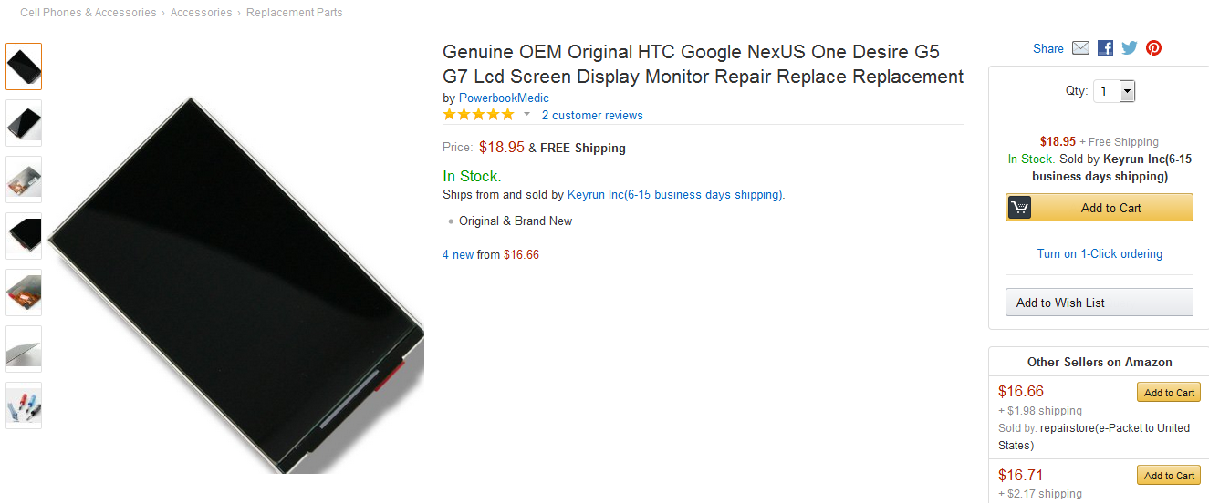Now, the search for the Samsung AMOLED 60H00287-009 screen begins. Gets hit up by one on eBay India, but it looks costly at 1800 bucks. Finds a cheaper one on Amazon.com here: